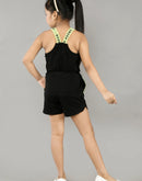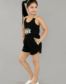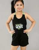Eurynome Kidswear Girls – Cotton Lycra Sports Hot Pant Set, Bold Black with Neon Accents, "Never Give Up" Slogan, Sporty Crop Top & Comfy Fit Athleisure for Ages 3-6