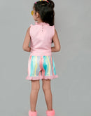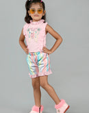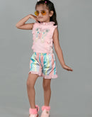 Eurynome Kidswear Girls – Ruffle top & pastel short set, butterfly appliqué, foil wave shorts, comfy chic for ages 3-9.