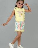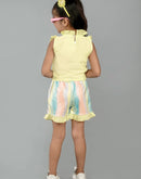 Eurynome Kidswear Girls – Ruffle top & pastel short set, butterfly appliqué, foil wave shorts, comfy chic for ages 3-9.