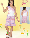 Eurynome Kidswear Girls – Asymmetric romper with chic single-shoulder, bunny detail, stylish belt, and pleated skirt flair. Perfect for standout style ages 3-9.