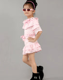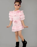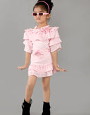 Eurynome Kidswear Girls – Ruffled Off-Shoulder Party Set, Double Layer Frills, 3D Floral Embellishments, Fitted Bow Waist, Flowy Mini Skirt, Twirl-Ready Festive Look Ages 3-9