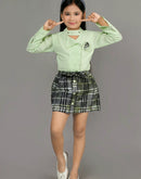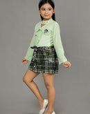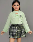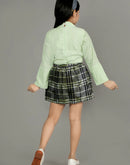 Eurynome Kidswear Girls – Lounge-Ready Round Neck Skirt & Top Set, Frilled Sleeves, Hand Embroidered Floral Broach, Extra Soft Checked Mini Skirt, Flower Knot Belt, Relaxed Chic Ages 3-6.