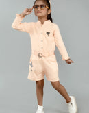 Eurynome Kidswear Girls – Mandarin Stylish Romper, Full Sleeve, Statement Collar, Luxe Buttons, Designer Belt, Unique Embellishments, Ages 3-6.