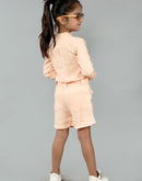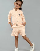 Indulge in ultimate luxury with our exquisite MANDARIN STYLISH ROMPER. This baby peach-coloured romper features full sleeves and a mandarin collar, adding to its cute and fashionable look. Adorned with unique embellishments, this romper is the epitome of exclusivity. Stand out in style with this one-of-a-kind piece.